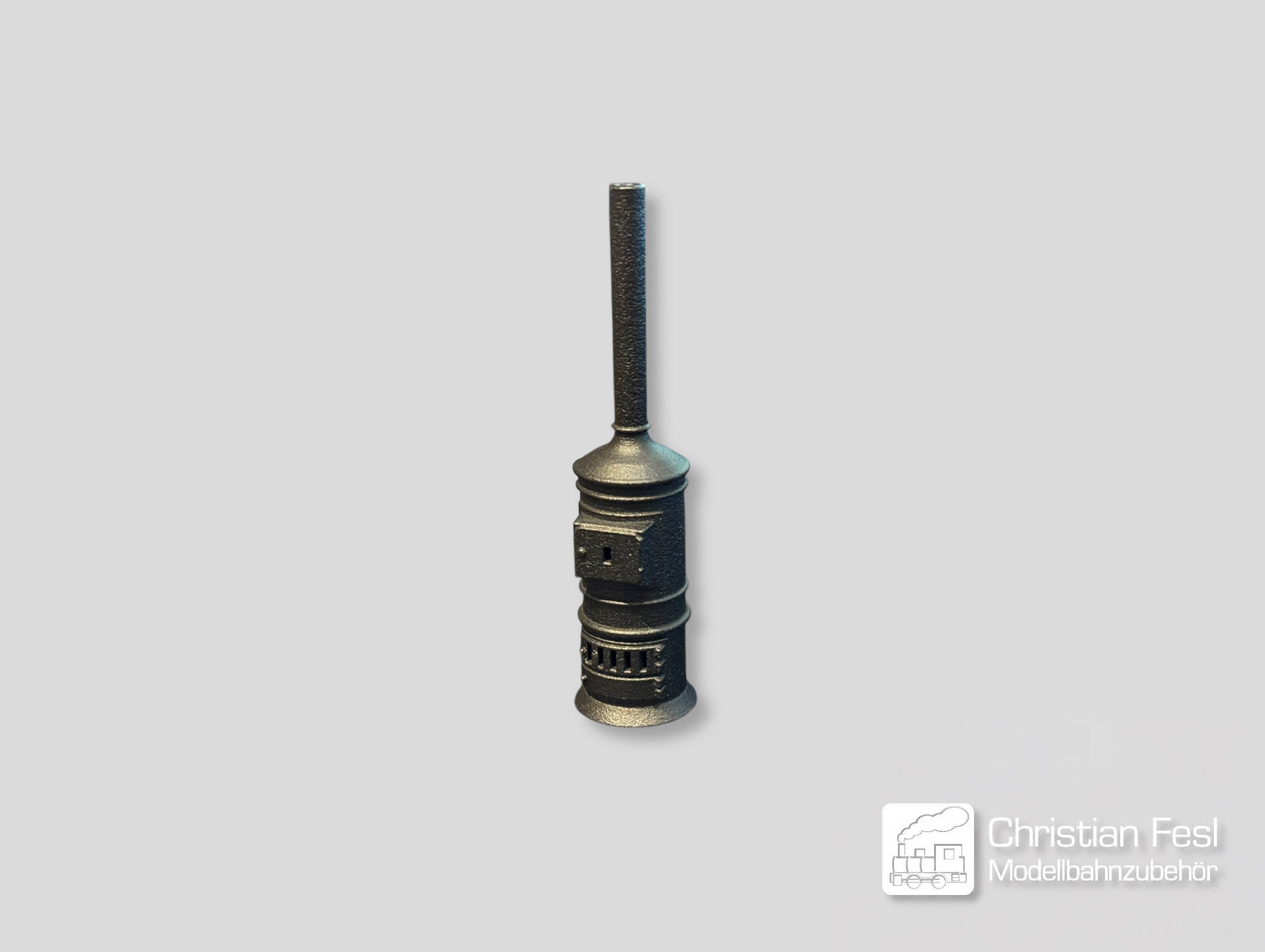 Modell eines alten Kanonenofens in schwarz. Der Ofen ist von innen hohl und die Gitter durchbrochen, so kann er mit einer Feuerimitation beleuchtet werden,