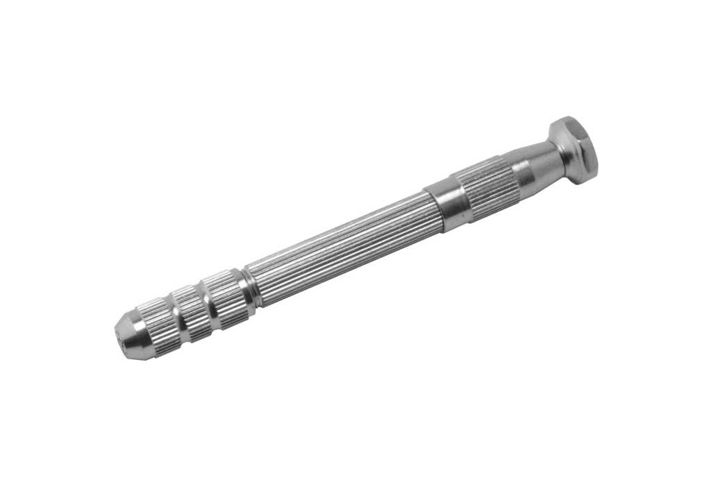 Werkzeughalter mit gerändeltem und vernickeltem Messingheft, drehbarer Handauflage mit Schraubkopf und 2 gehärteten, doppelseitigen Spannzangen.