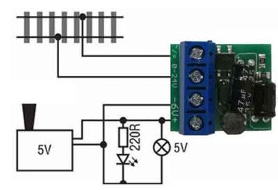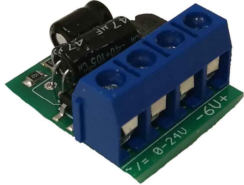 Der 6V Regler dient zur Erzeugung eine stabilisierten Ausgangsspannung von 6V. Durch seine moderne Schaltreglertechnik erzeugt er so gut wie keine Abwärme. Analogfahrer können hiermit ihre Beleuchtung Dampf gleichmäßig regeln. Digitalfahrer nutzen die Regelung zur Versorgung von RC-Servos sowie für Lüftermotoren bei gepulsten Verdampfern. Der Anschluss erfolgt über 4 stabile Schraubklemmen.