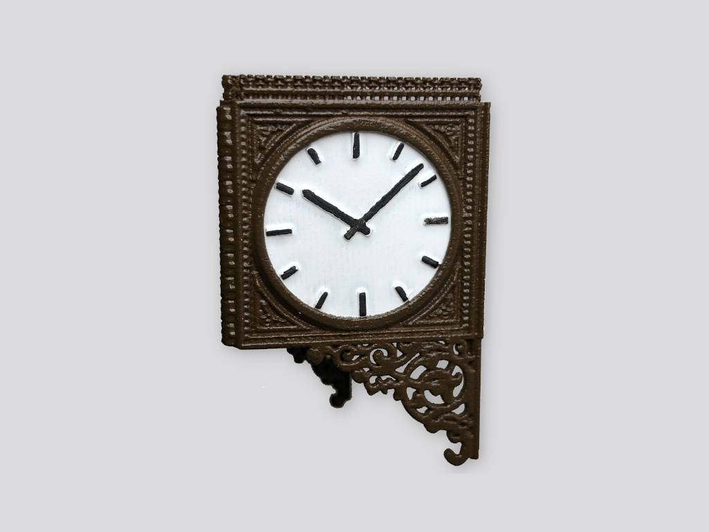 Nasenuhr nach dem Vorbild des Bahnhofes Drei Annen Hohne im Harz. Die Uhr ist braun lackiert. Ziffernblätter handbemalt.