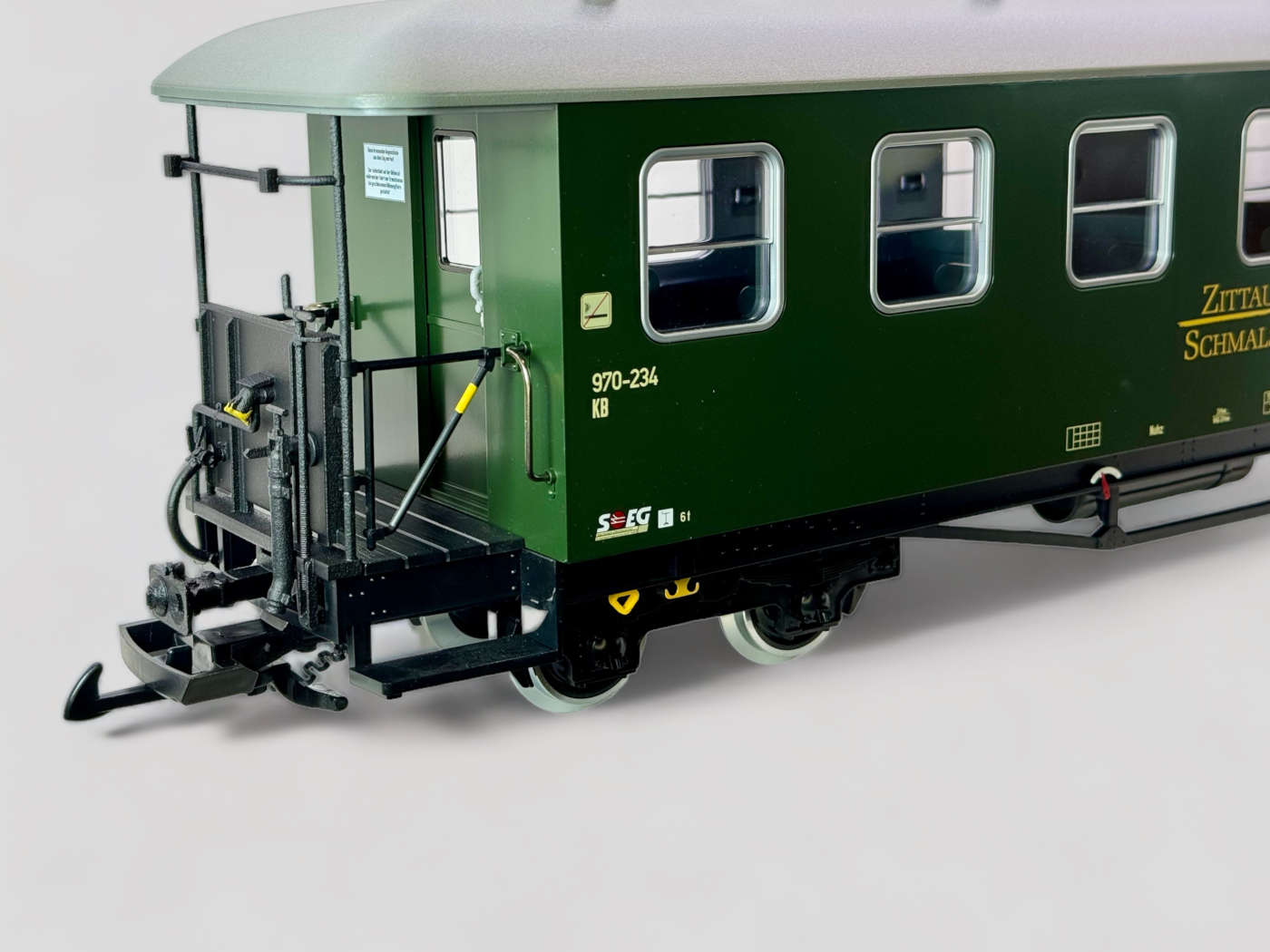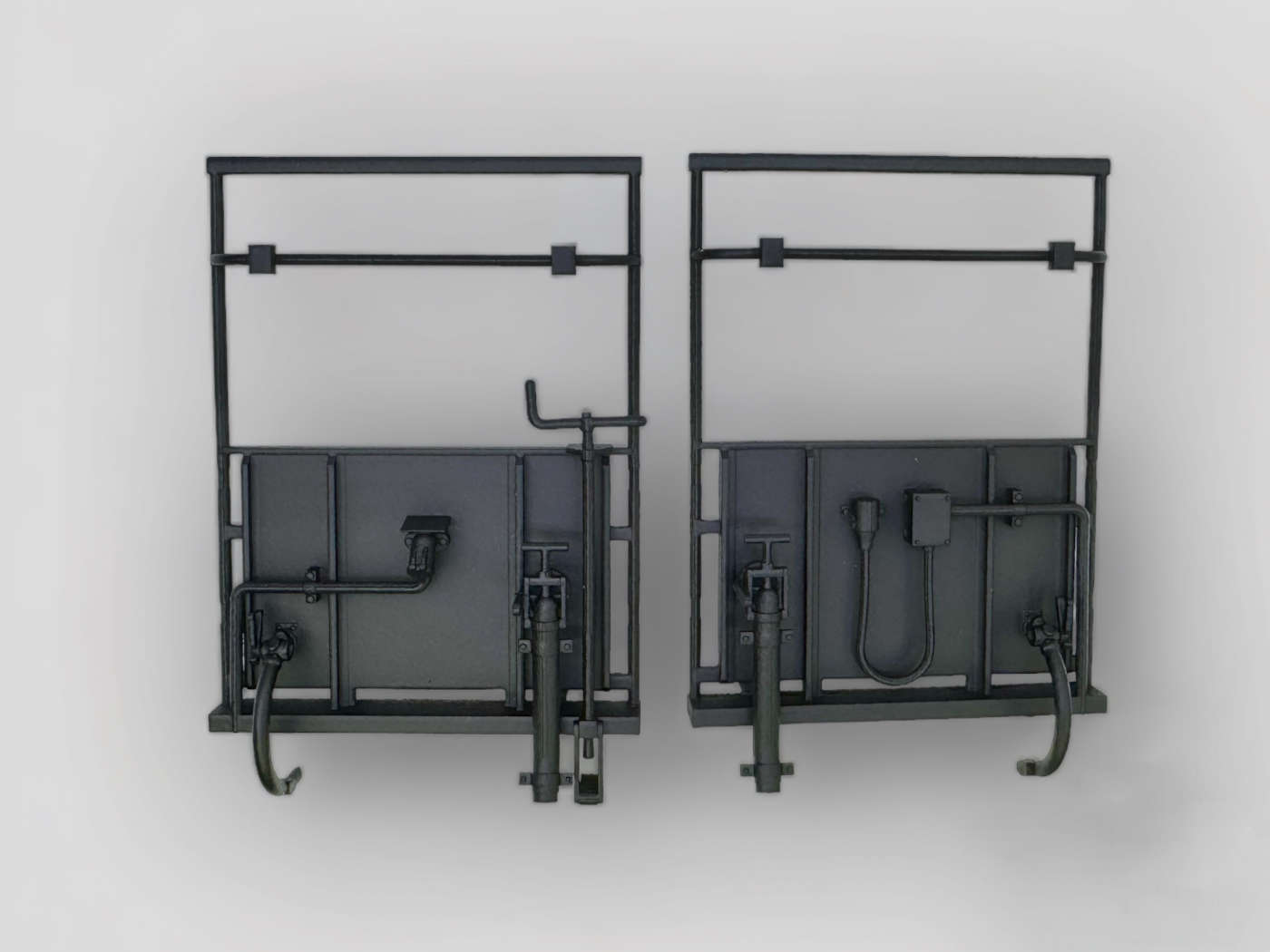 Bühnenenden, wie sie an vielen sächsischen Personenwagen verbaut sind. Das Modellbildet die geschlossene glatte Variante nach. Anschlüsse vorbildgerecht beidseitig unterschiedlich.