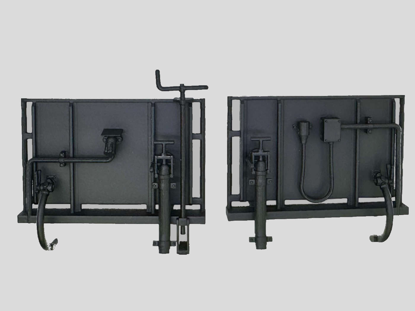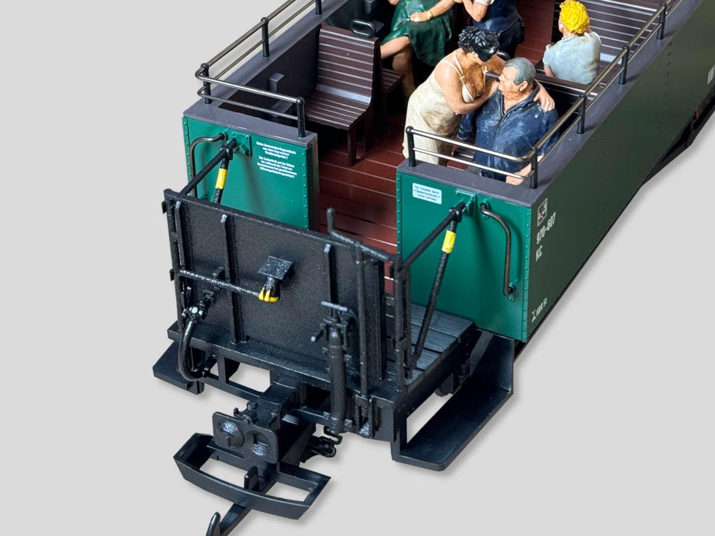 Bühnenenden, wie sie an vielen sächsischen Aussichtswagen verbaut sind. Das Modellbildet die geschlossene glatte Variante nach. Anschlüsse vorbildgerecht beidseitig unterschiedlich.