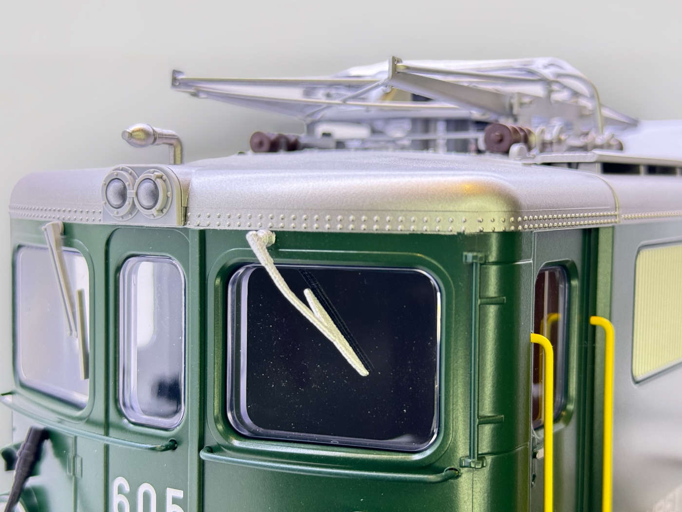 Einarmwischer für das in Fahrtrichtung linke Fenster der Ge 4/4 I in grün. (Ausführung mit Mitteltür).