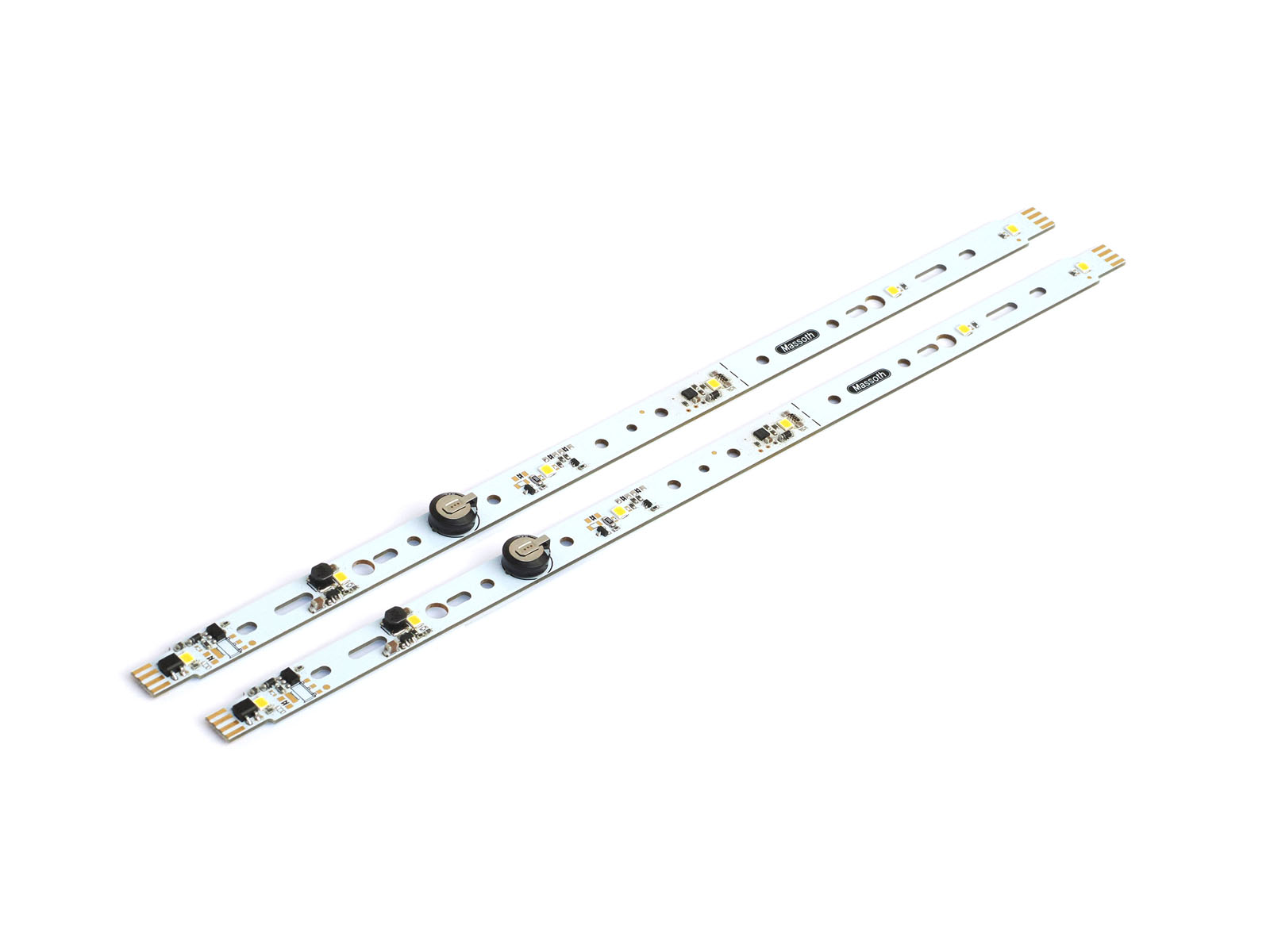 Durch den Einsatz großflächiger Spezial-LEDs wird der Wagon deutlich besser ausgeleuchtet. Ein fest integrierter Puffer versorgt die Lichtleiste bis zu 30 Sekunden. Zwei zusätzliche Ausgänge arbeiten im Analogbetrieb richtungsabhängig, bei der digitalen Variante (VHDM DCC-kompatibel) sind sie mit verschiedenen Effekten frei programmierbar.