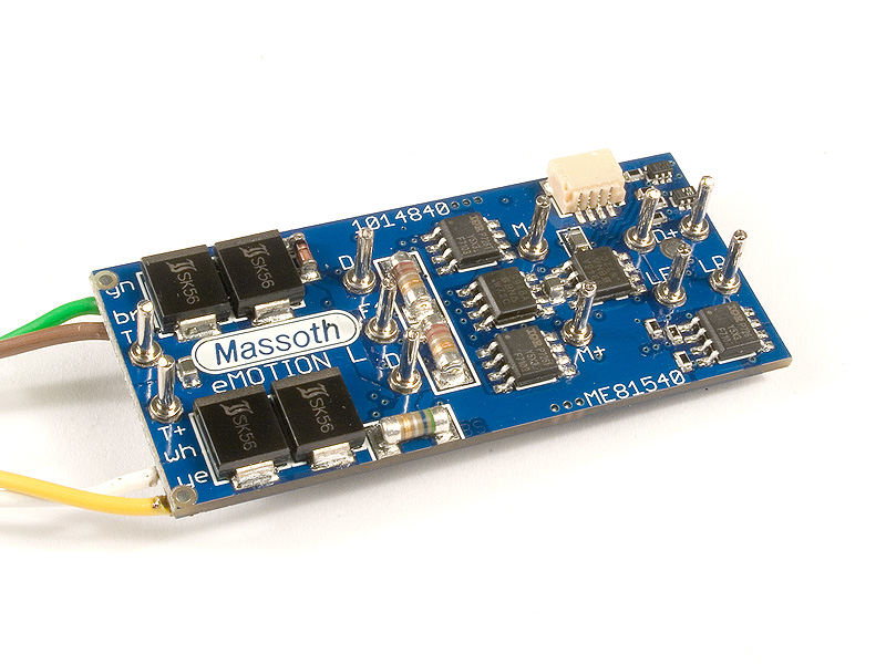 Universeller 1,8 Ampere Fahrdecoder mit 8 Funktionsausgängen, geeignet für Loks mit 1 Motor. Der eMotion L Decoder ist ein kompakter Fahr- und Funktionsdecoder, der optimal für die Anforderungen im Großbahnbetrieb konzipiert ist. Er bietet neben dem Motorausgang für einmotorige Loks bis zu 8 programmierbare Funktionsausgänge. Der eMOTION L Decoder bietet hervorragende digitale und analoge Fahreigenschaften. Besonders zu betonen ist auch die gute Analogfähigkeit des Decoders der bereits ab ca. 7 bis 8 Volt stabilen Betrieb erlaubt. Mit einem zusätzlichen Spannungspuffer kann er seinen Dienst im Analog- und Digitalbetrieb noch sicherer verrichten und umgeht dadurch aussetzen durch verschmutzte Stellen auf dem Gleis.